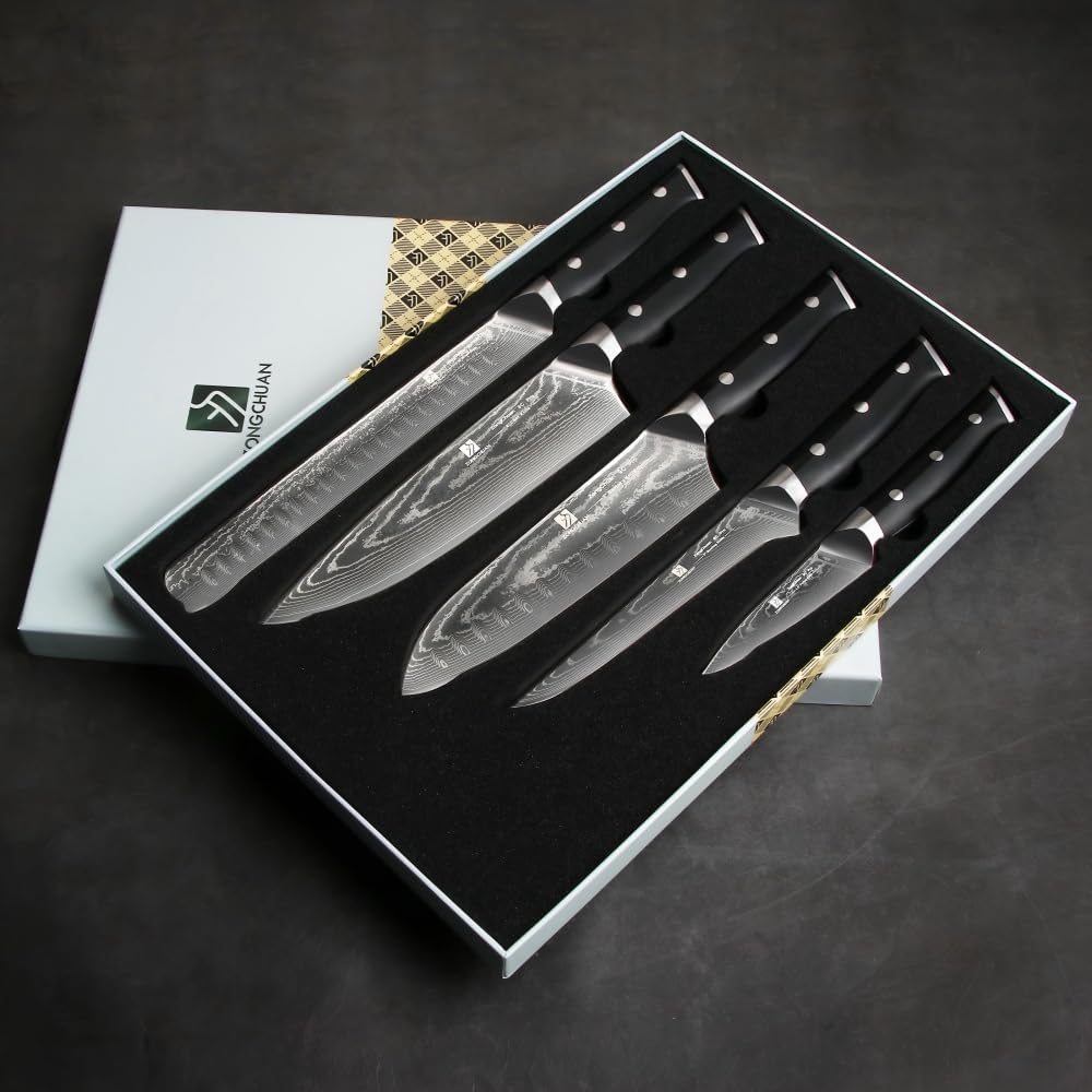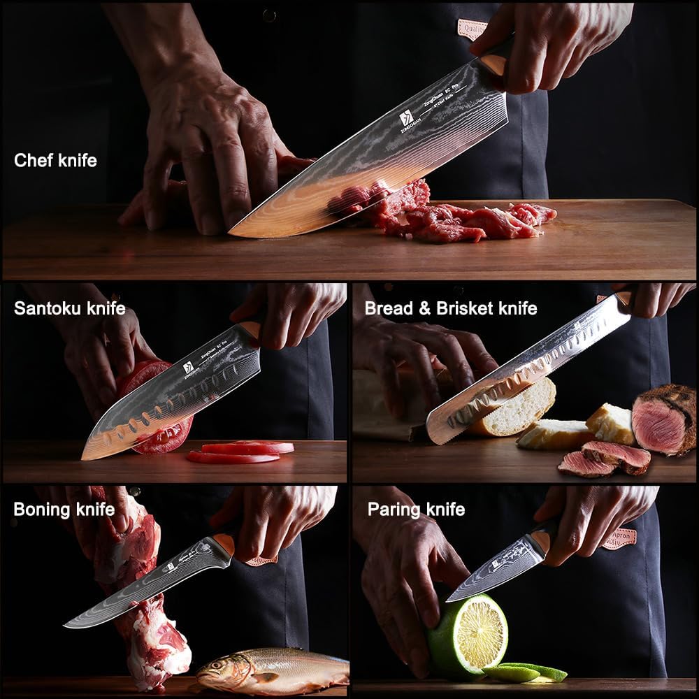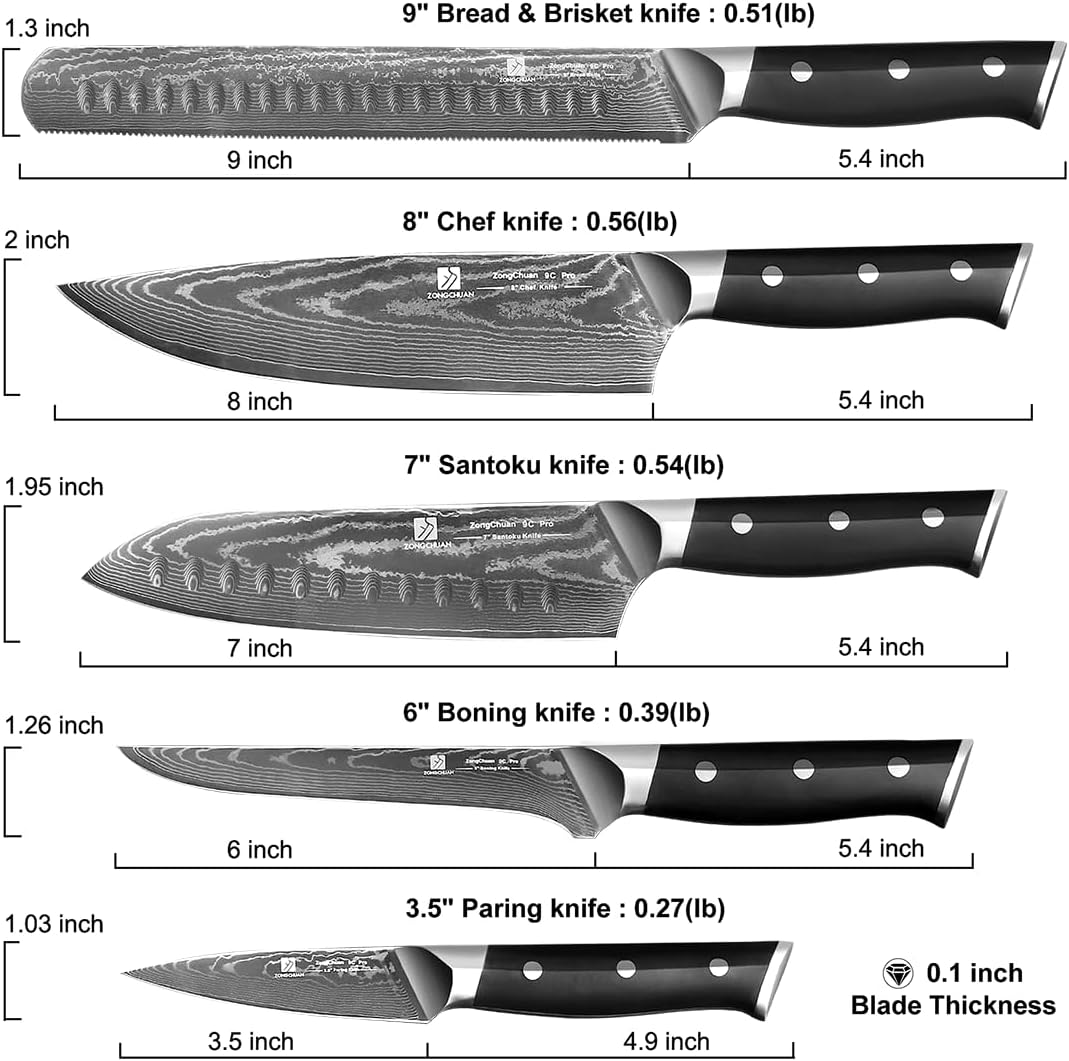 - 【Multi-Function Damascus Knife Set】 This 5-piece set includes 8″ chef knife, 9″ serrated bread & brisket knife, 7″ santoku knife, 6″ boning knife, and 3.5″ paring knife for complete kitchen coverage. Effortlessly handles chopping, slicing, dicing, and mincing meats, fruits, and vegetables. Perfect for both home and professional kitchens, each blade excels in specialized tasks from precision trimming and bone removal to heavy-duty chopping, delivering exceptional versatility and performance.