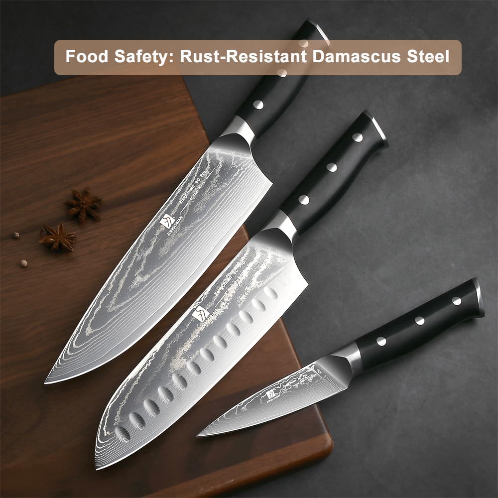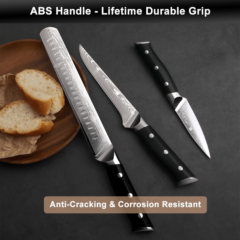 - 【Premium High-Carbon Stainless Steel】 Made from 9CR18MOV Damascus steel knife blades (60±2 HRC), this knife set offers exceptional sharpness and durability. Featuring 67-layer forged construction and precision 15° blade grinding, each knife delivers razor-sharp edges with superior wear resistance and corrosion protection. Ideal for home cooks and professionals alike, combining Japanese craftsmanship with reliable performance.