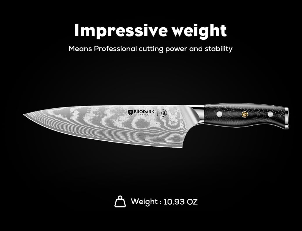 - Real Damascus Steel: BRODARK knife set is forged from 67 layers of 10Cr15CoMoV Damascus steel, achieving a hardness of 60 HRC with a potential variance of 2 HRC. The pattern emerges from carbon steel layers, heat treatments, and intensive folding and forging, ensuring enduring quality