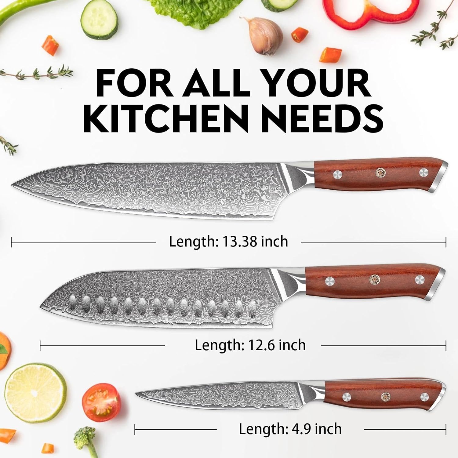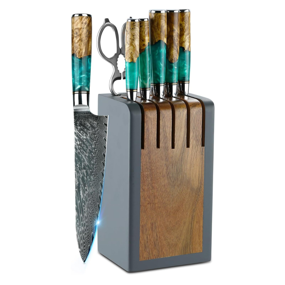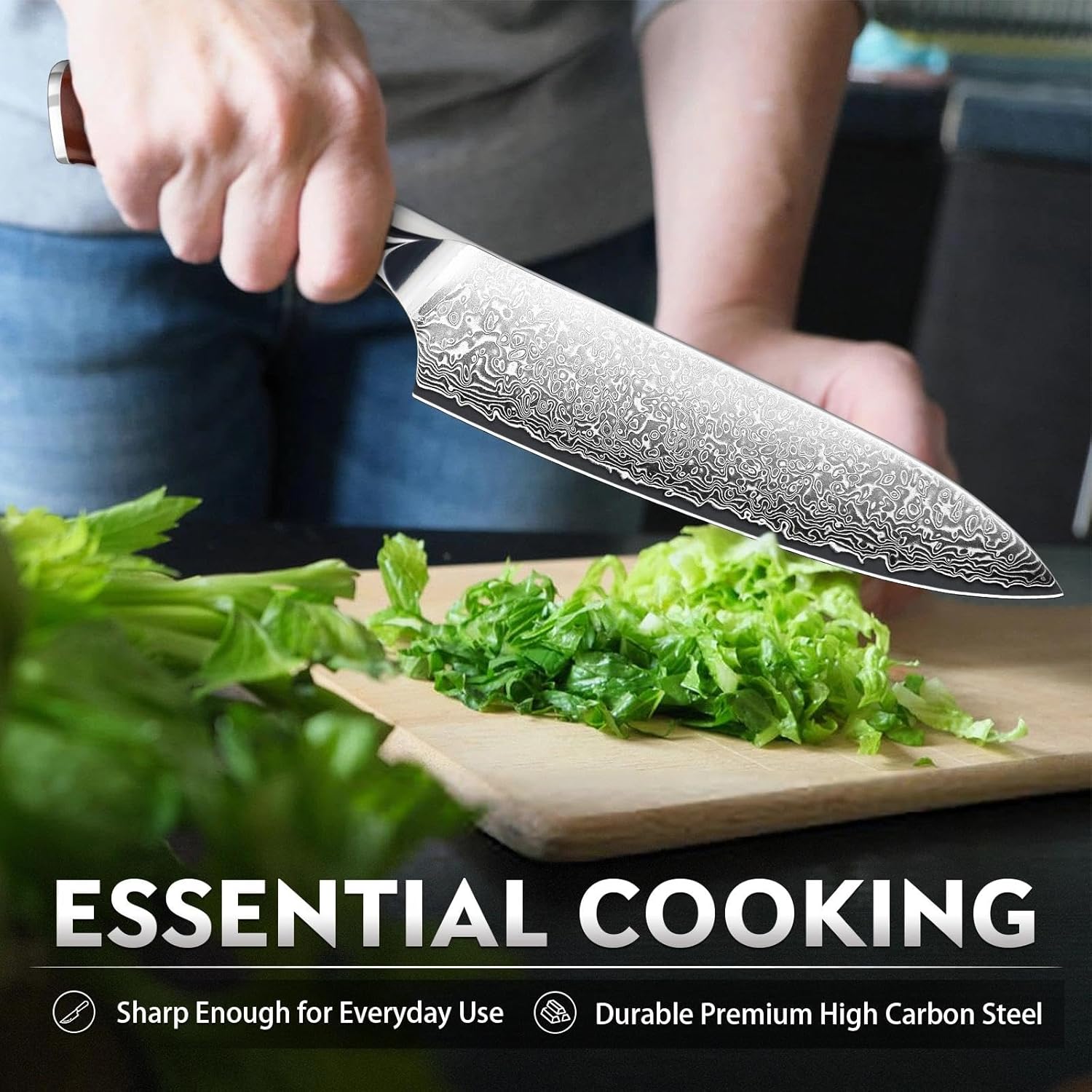 • Elegant Design: Each knife features a stunning, unique Damascus pattern paired with a luxurious walnut handle. This set doesn’t just perform—it elevates your kitchen’s style with its sophisticated and elegant presence.