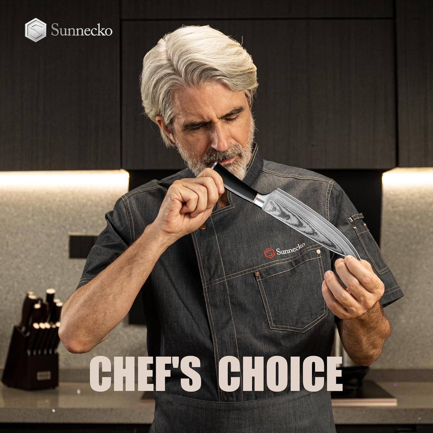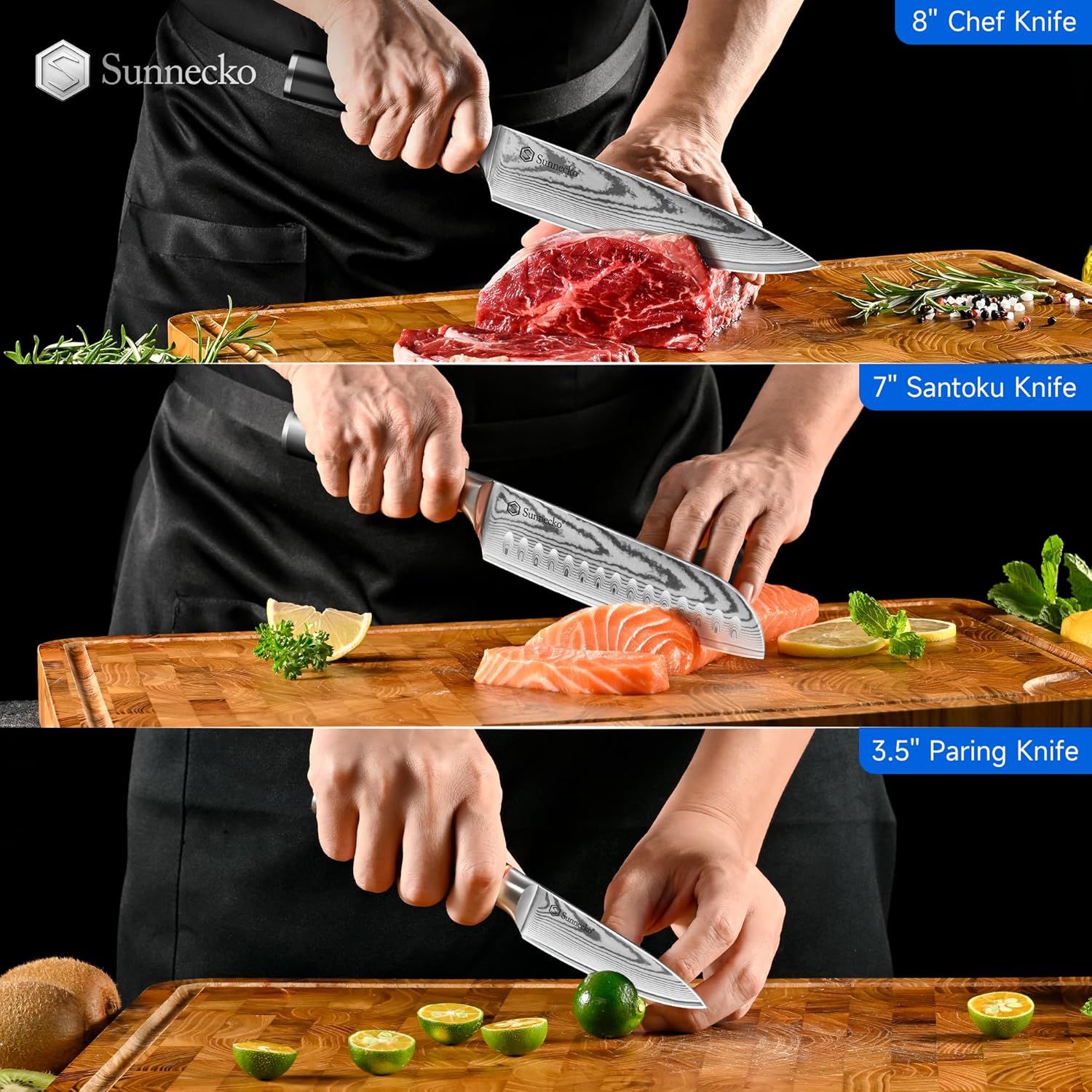 - 67-Layer Damascus Steel:Sunnecko Damascus Knife Set is made of Premier Japanese Steel VG10 Knife Core with 62 HRC high hardness.It’s Real Damascus Knives with newest and most advanced forging technique.You will receive a professional and extremely sharp Kitchen Knives Set!