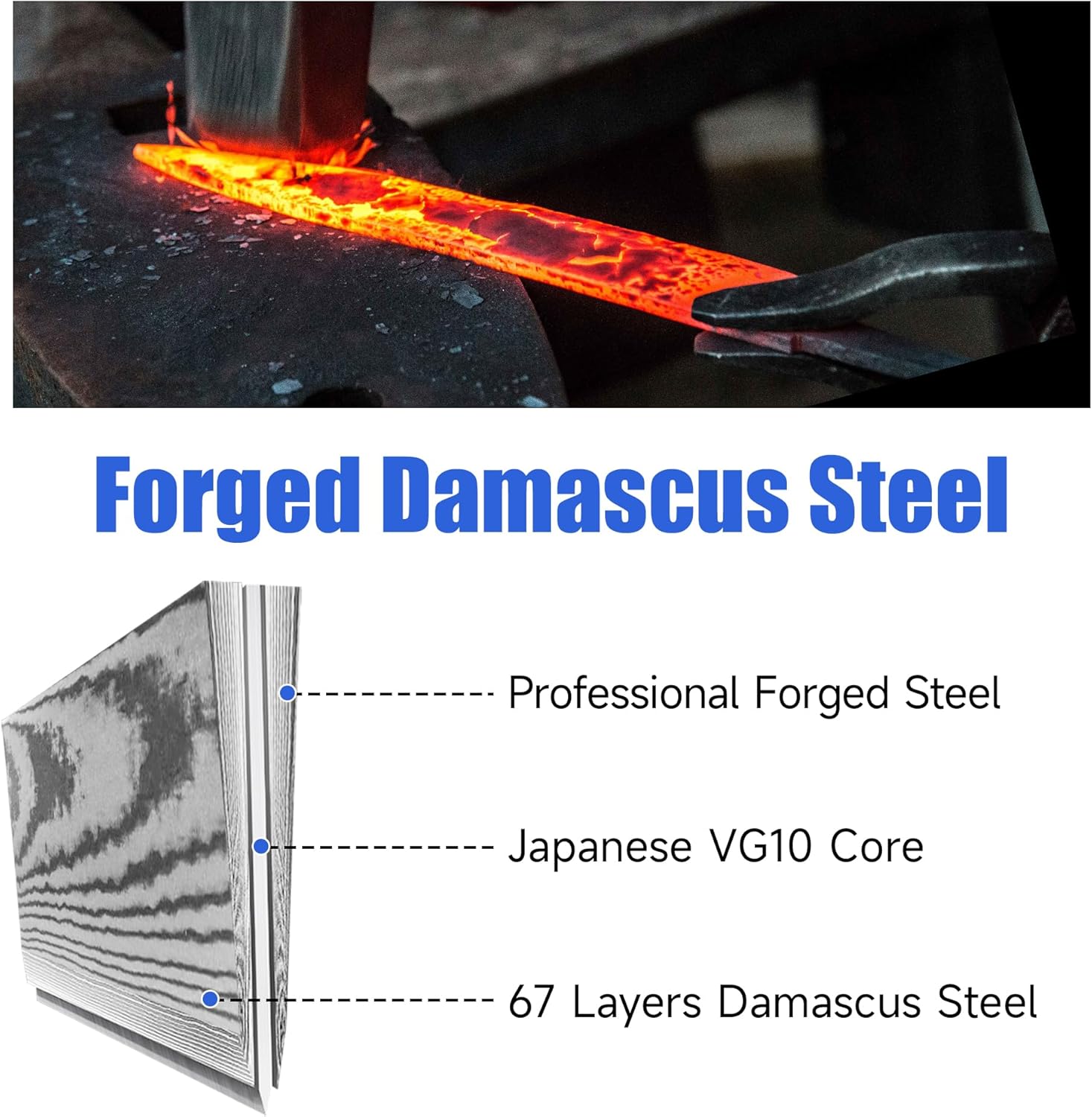 - Perfectly Balanced Performance: This 67-layer construction delivers outstanding corrosion resistance,exceptional toughness,and well balance for a superior cutting experience.Users can more precisely control the angle and force of the knife for excellent balance,thereby improving work efficiency and reducing operational difficulty.