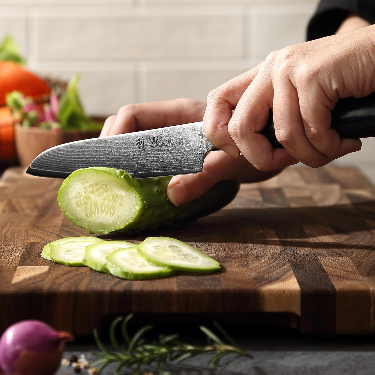 • Ergonomic Micarta handles for balanced control – Durable Micarta handles provide a comfortable, slip-resistant grip with ideal weight balance. Their contoured shape reduces hand fatigue and enhances handling accuracy, making this sharp knife set suitable for both professional chefs and home cooks.