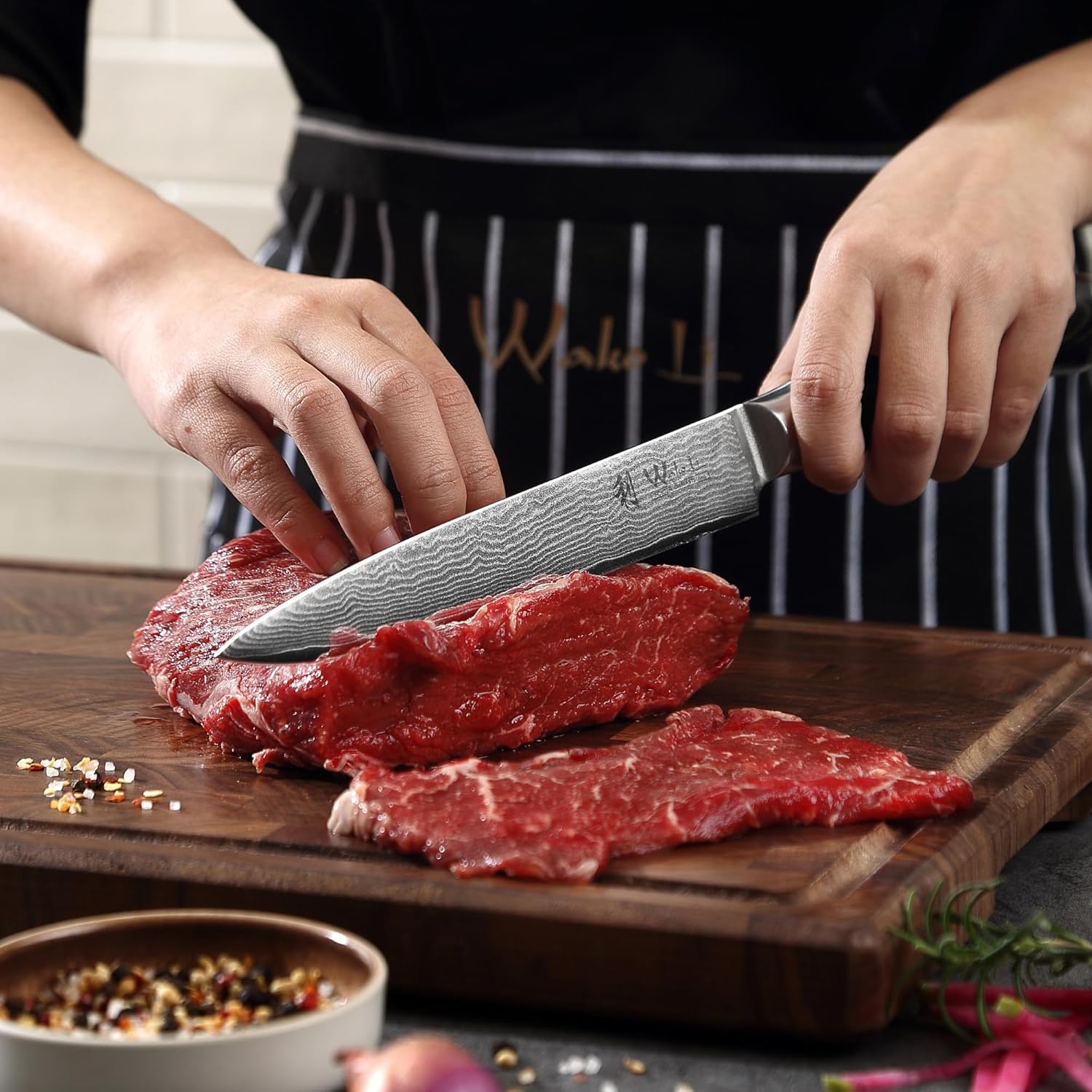 • Precision sharpening for smooth, effortless cuts – Each knife in this cooking knife set is honed to a fine 12–14° cutting angle, providing clean, controlled slices through meat, vegetables, and fruit. The VG10 core (approx. 60 ±2 HRC) offers superior edge retention, maintaining long-lasting sharpness with minimal maintenance.